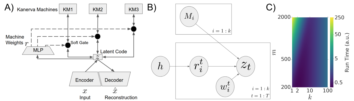 An ideal cognitively-inspired memory system would compress and organize incoming items. The Kanerva Machine (Wu et al, 2018) is a Bayesian model that naturally implements online memory compression. However, the organization of the Kanerva Machine is limited by its use of a single Gaussian random matrix for storage. Here we introduce the Product Kanerva Machine, which dynamically combines many smaller Kanerva Machines. Its hierarchical structure provides a principled way to abstract invariant features and gives scaling and capacity advantages over single Kanerva Machines. We show that it can exhibit unsupervised clustering, find sparse and combinatorial allocation patterns, and discover spatial tunings that approximately factorize simple images by object.