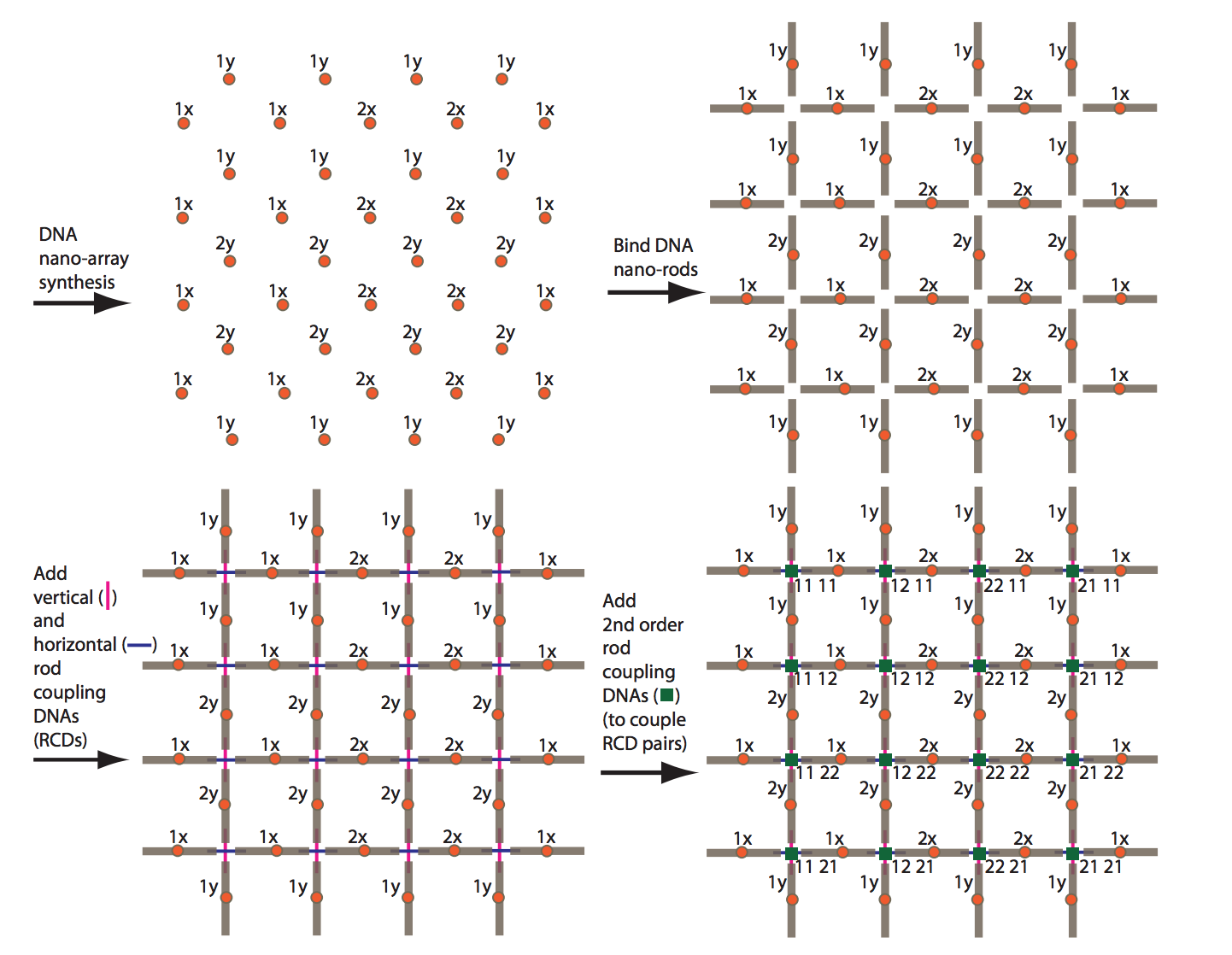 No integrated architecture has yet been proposed which fully specifies how to produce structures with a) overall sizes on the scale of today’s computer chips (centimeters), b) addressable features on the 10 nm scale, and c) the ability to attach a wide range of discrete molecular components at customizable locations. We are investigating schemes for nanometer-to-centimeter fabrication integration via top-down organization of DNA nanorods using DNA hybridization interactions, as well as other architectures.
