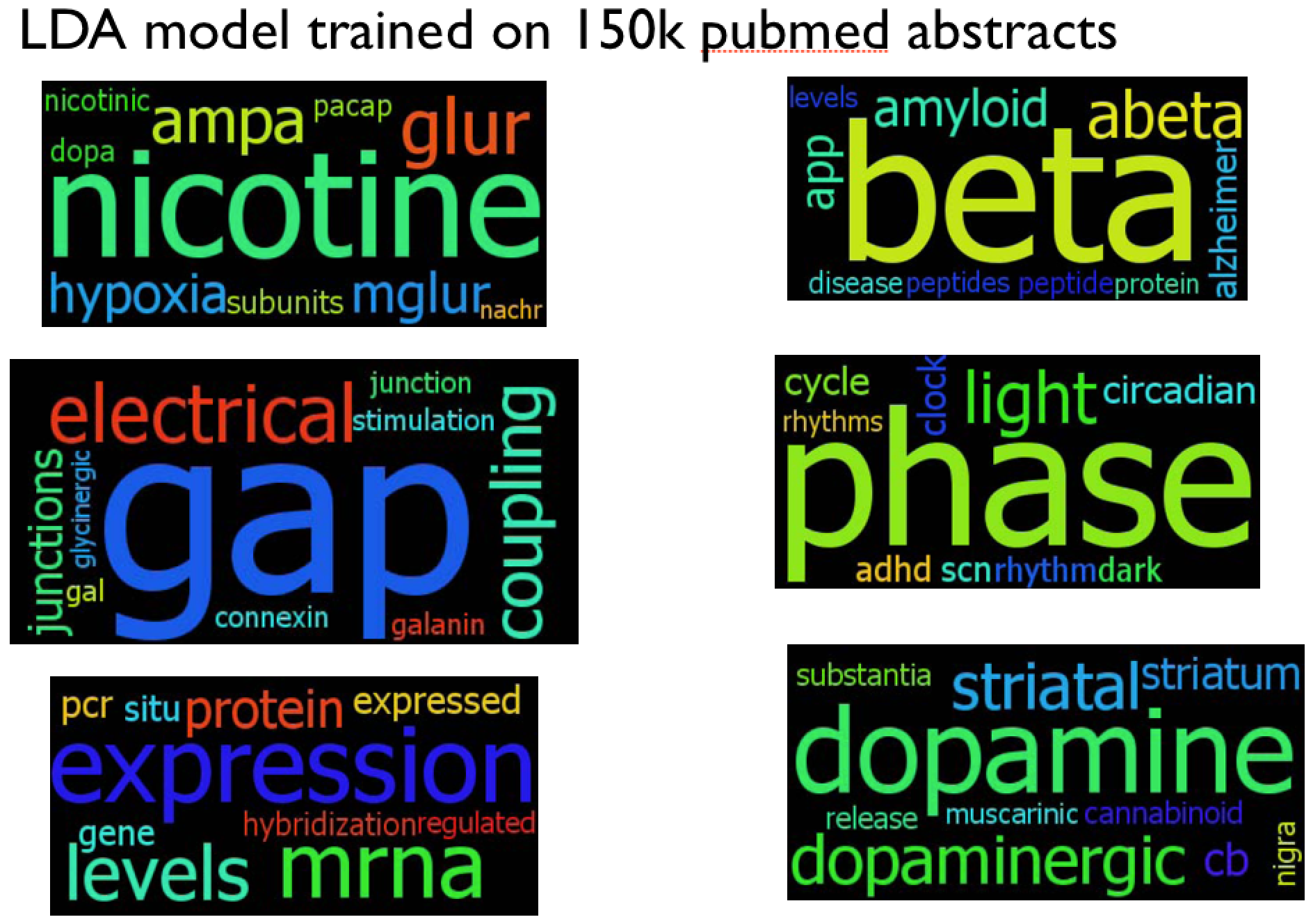 LDA topic modeling also reveals coherent research topics, like Alzheimer's disease, circadian clocks, the dopamine system and gap junctions.