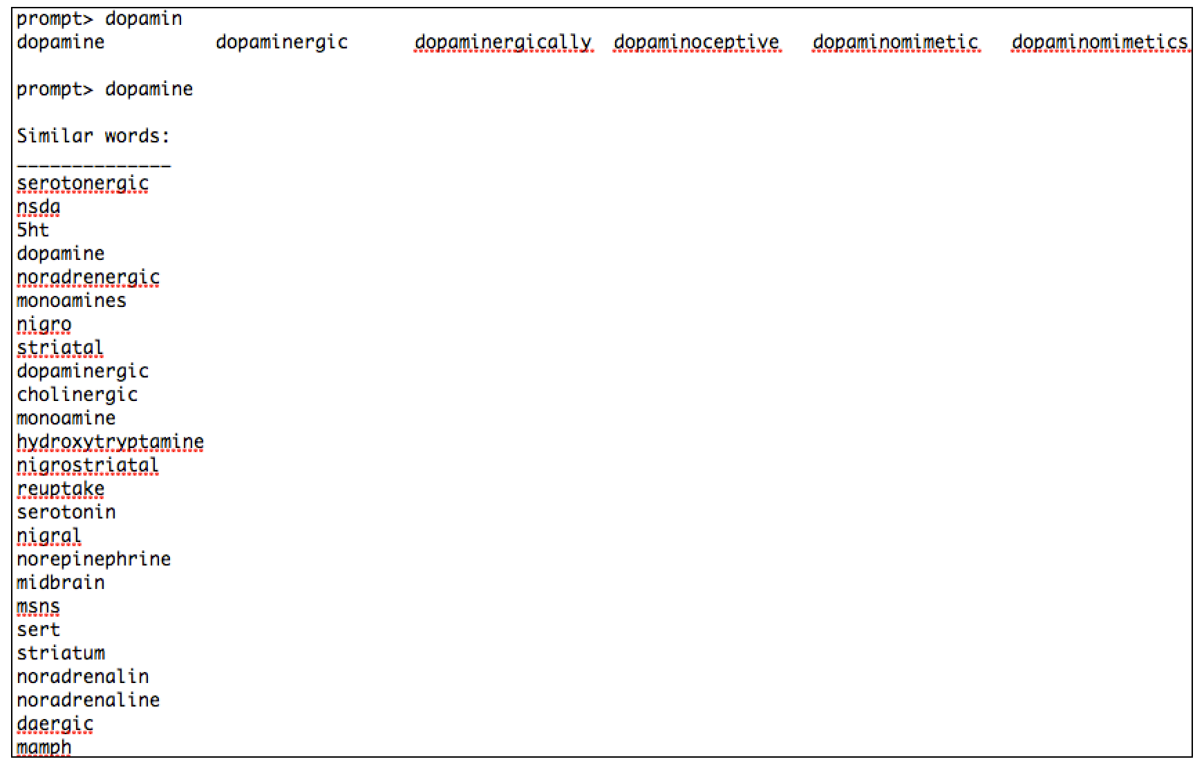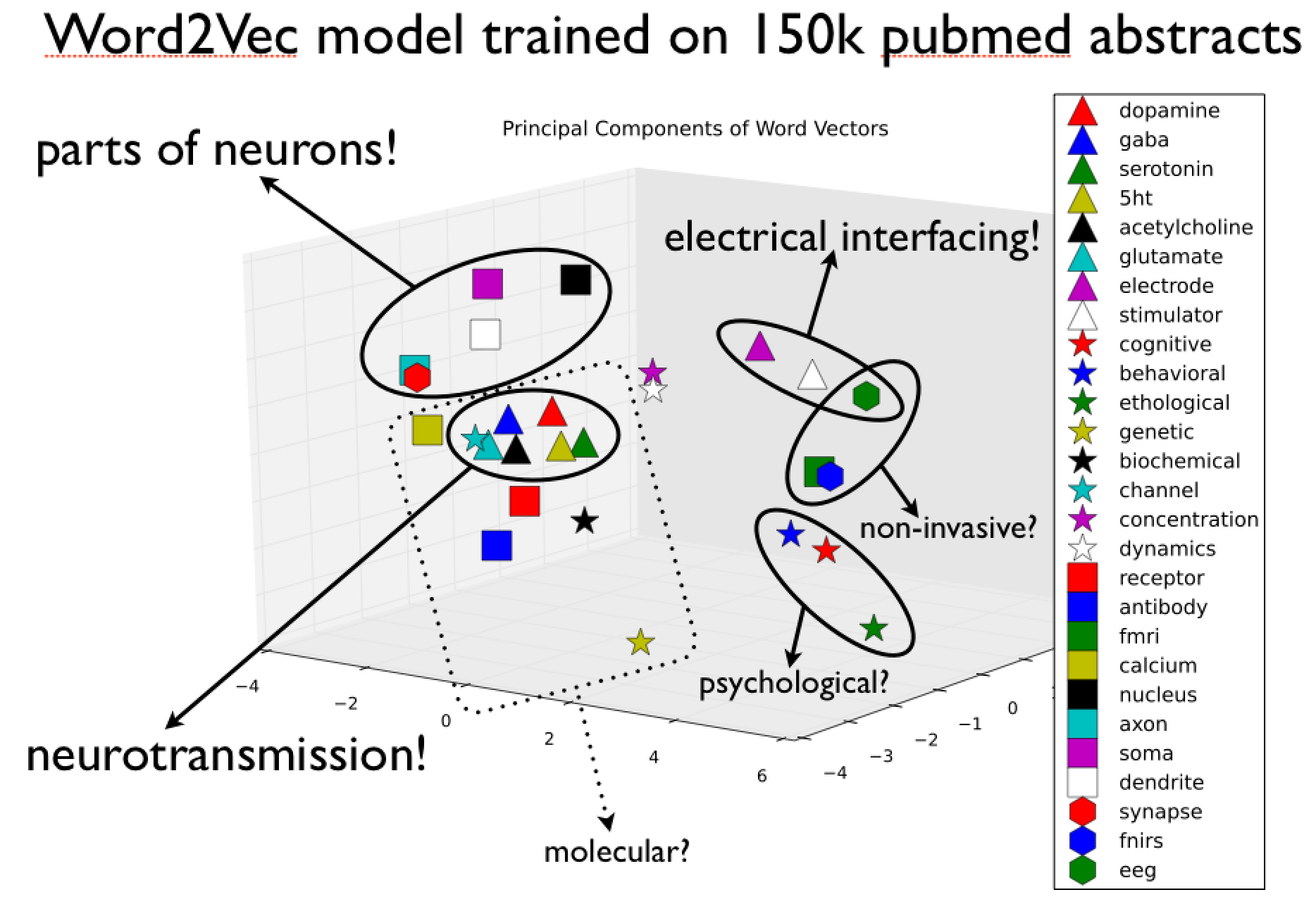 Word2Vec analysis of even this very small corpus extracts meaningful semantic categories of technical words, such as the names of neurotransmitters.