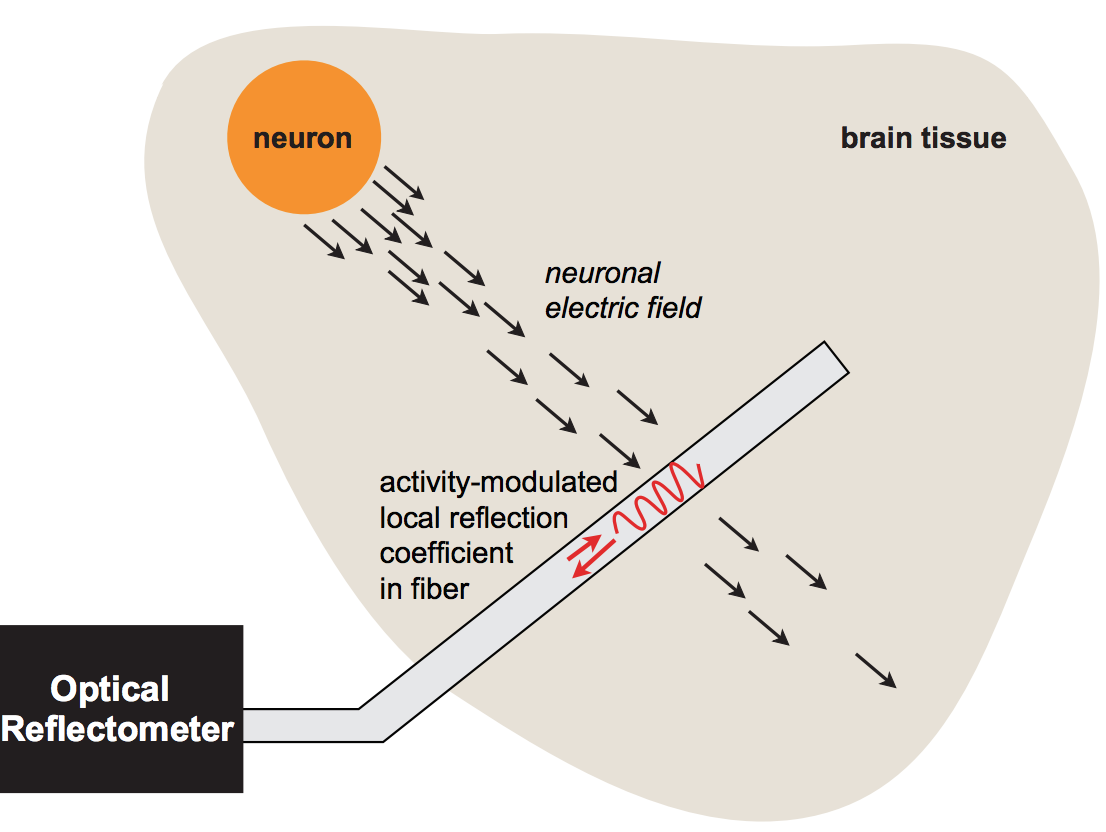 We introduce a fiber-optic architecture for neural recording without contrast agents, and study its properties theoretically. Our sensor design is inspired by electrooptic modulators. A key concept of the design is the ability to create an "intensified" electric field inside an optical waveguide by applying the extracellular voltage from a neural spike over a nanoscopic distance.